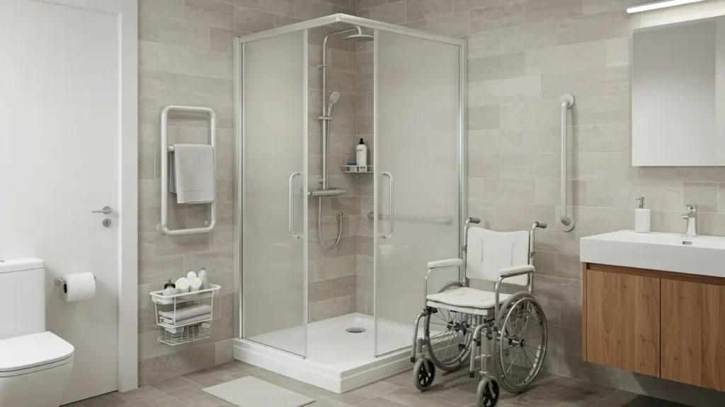 La douche senior est spécialement conçue pour répondre aux besoins des personnes âgées ou à mobilité réduite, en combinant sécurité, accessibilité et confort.